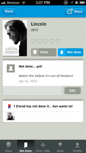 To-do lists and task managers are commonplace on the App Store, and it's sometimes hard for unique apps to stand out. But a recently launched app from Betaworks called Done Not Donesurprisingly manages to do so. Don't let the name fool you, this app doesn't focus on the boring things you need to do, like picking up more milk or sending out 15 résumés. The goal of Done Not done is to get you to log the fun things you want to do, like films you'd like to see, albums you'd like to listen to, or books you want to read, and then see whether any of those interests overlap with those of your friends. That way, you can buddy up and share the experience.